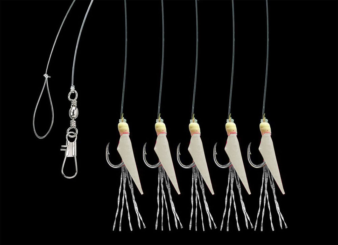 Heringsvorfach mit 5 Haken und echter Fischhaut. Die Größen 4, 6 und 8 sind an extra stabile Monoschnur gebunden. Made for Norway!