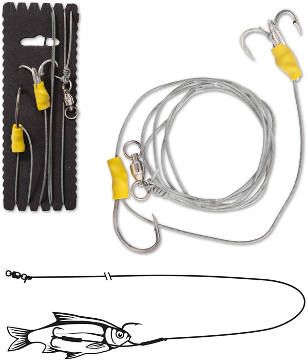 Spezialvorfach für die Präsentation von Köderfischen kurz über dem Gewässergrund. Durch die U-Pose schwebt der Köderfisch über dem Boden. Das Vorfach eignet sich für fließende und stehende Gewässer. Größe L Haken #2/0-5/0 Länge 180cm Tragkraft 100kg Größe XL Haken #3/0-6/0 Länge 180cm Tragkraft 100kg