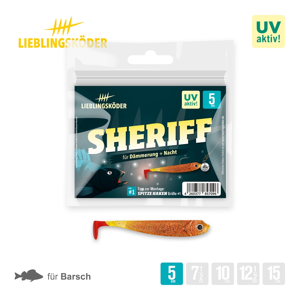 Sheriff - eignet sich besonders gut für die Dämmerung und die Nacht. Dieser uv-aktive Gummiköder ist in der Dunkelheit selbst dann noch sichtbar, wenn ein Köder ohne UV-Aktion bereits verschwunden wäre. Es können also deutlich mehr Bisse erfolgen, weil der Zander seine Beute besser sehen, verfolgen und attackieren kann.