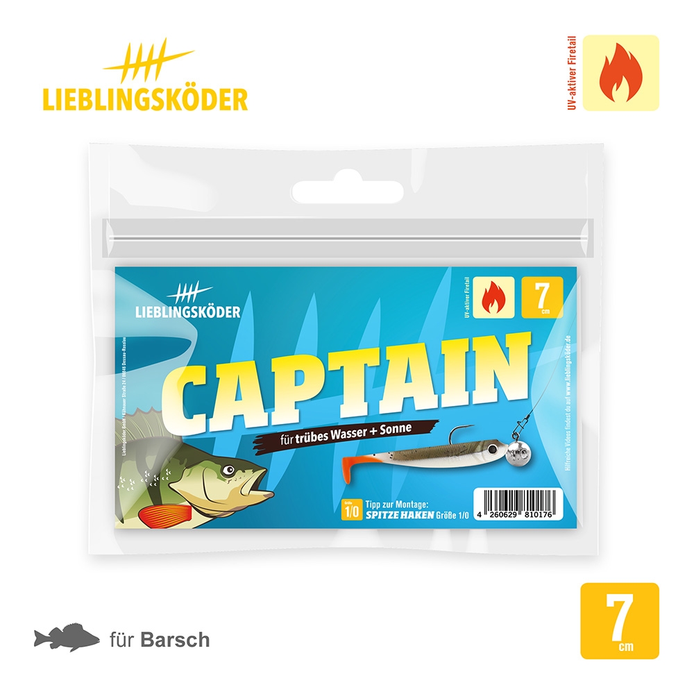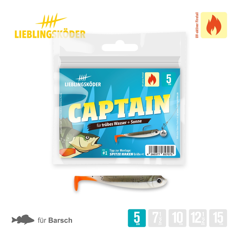 Der Lieblingsköder Captain hat eine Länge von 12,5 cm. Der Rücken schimmert grün-bläulich wie z.B. bei Stinten, Ukeleis, Moderlieschen und einer Vielzahl anderer Weißfische. Der Bauch ist weiß und damit auch in trübem Wasser gut sichtbar. Das besondere Highlight beim Lieblingsköder Captain ist der orangefarbene, UV-aktive Schaufelschwanz. Wie bei allen Lieblingsködern arbeitet der Schwanz bereits bei leichtem Zug und imitiert die Schwimmbewegungen eines Beutefisches ausgezeichnet.
