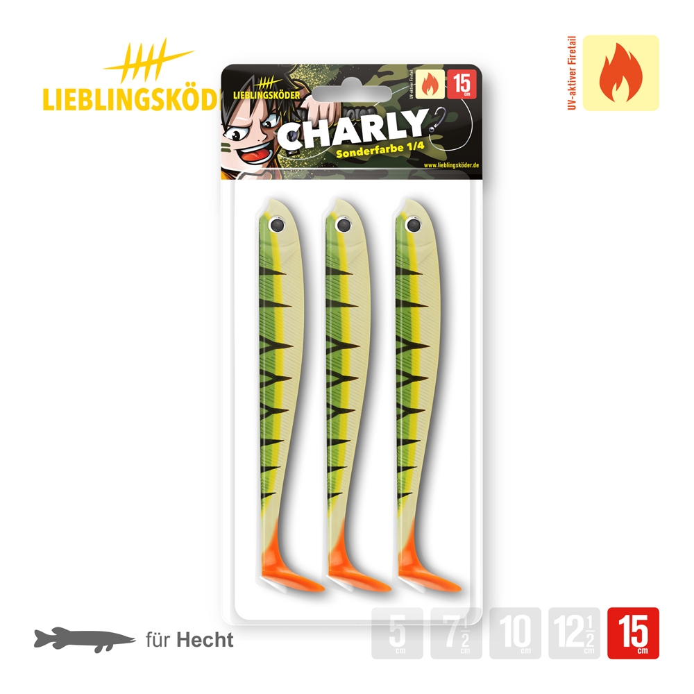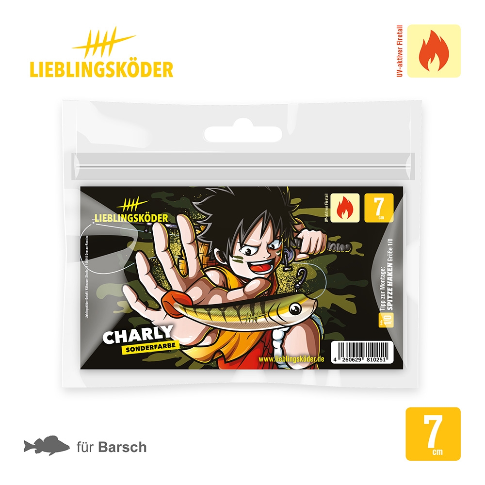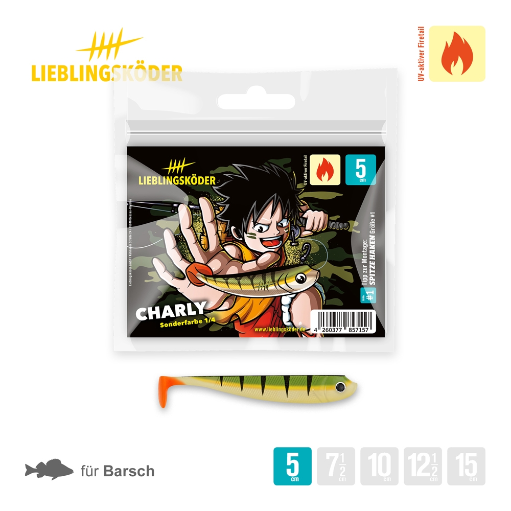 Auf den Seiten hat Charly die typischen schwarzen Barschstreifen und auch hier setzen wir wieder auf harte Kontrasten, damit dieser Köder aus der Masse hervorsticht und vom Räuber als Barsch wahrgenommen wird. Als Zusatzreiz haben wir uns dann noch für einen orangen Firetail entschieden, der ebenfalls uv-aktiv ist und den Köder abrundet.