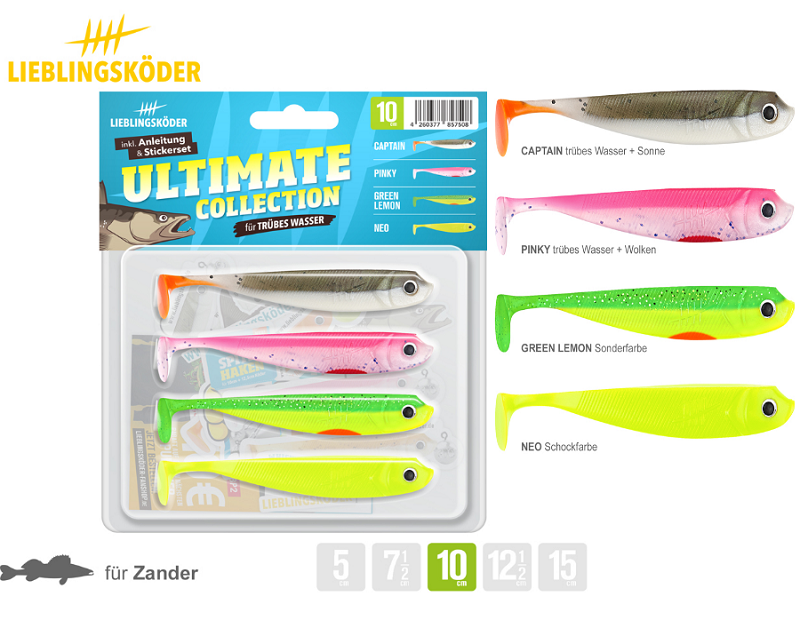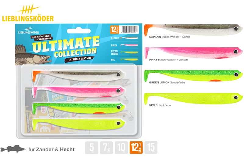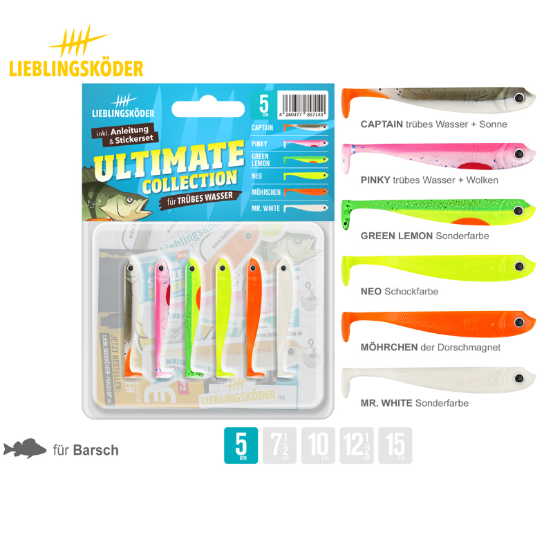 Die Ultimate Collection "trübes Wasser" ist das perfekte Mischpaket für alle Angeleinsteiger und Testangler. Diese Kollektion enthält 3bis 6 auffällige Dekore je nach Größe zum Barsch-Zander-Hechtangeln in trübem Wasser.