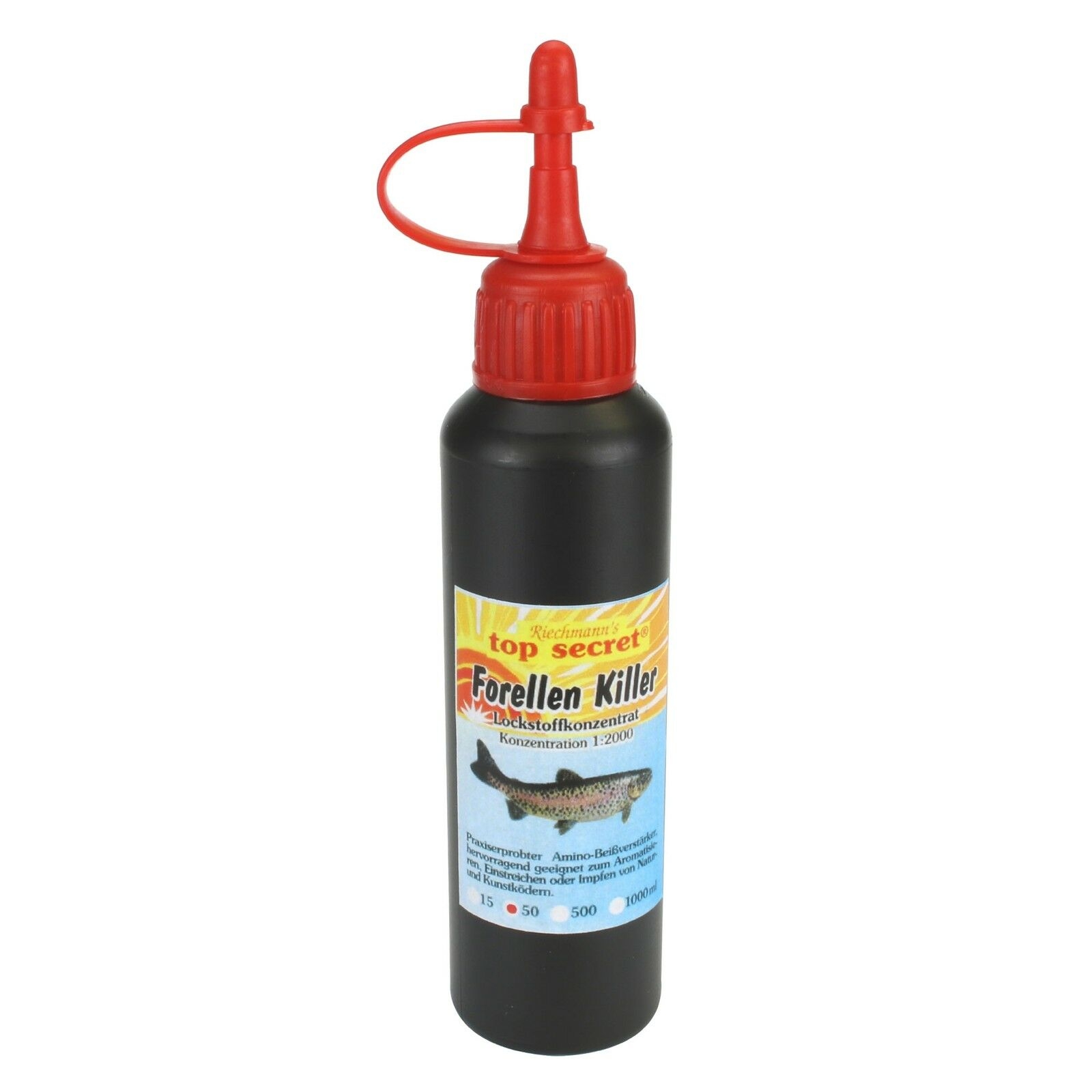 Auch Top Secret Killer-Lockstoffe enthalten hochdosierte Aromakomponenten und intensive Geschmacksfaktoren. Bei der Entwicklung dieser speziellen Flüssiglockstoffserie waren eine Reihe Praxistests notwendig um effektiv wirksame Zielfischaromen für bestimmte Fischarten zu finden.