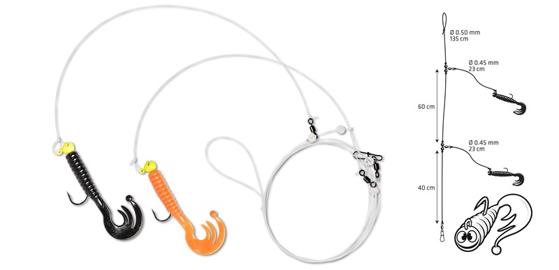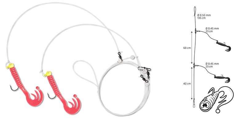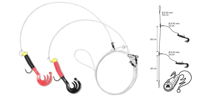 Das Zebco Trophy Cod Rig 40/60 ist mit einen Trophy LOOky Jig Head 3,5 g und Curly Tail 7,5cm ausgestattet.